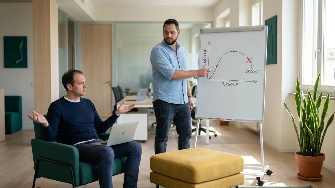 Il progetto è in ritardo. La deadline si avvicina. Il cliente preme. La reazione istintiva è spesso la stessa: aggiungere sviluppatori al progetto. Sembra logica elementare — più persone, più velocità. Nel software, però, l'effetto è spesso diverso da quello atteso.